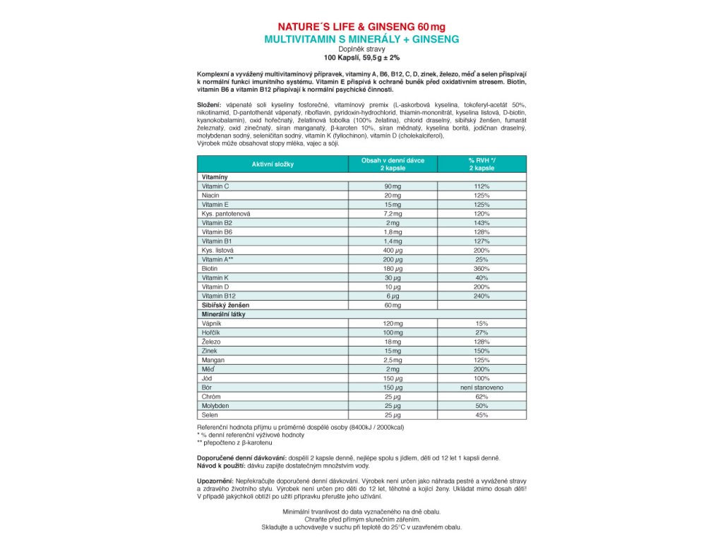 Unikátní vyvážený multivitamín s minerály Nature's Life je přípravek obohacený o 60 mg ženšenu, užívaný všemi věkovými kategoriemi k udržení potřebné denní hladiny vitamínů. Vyvážená denní dávka vitamínů, stopových prvků a minerálů přispívá k udržení dobrého zdravotního stavu a optimální rovnováhy organismu.